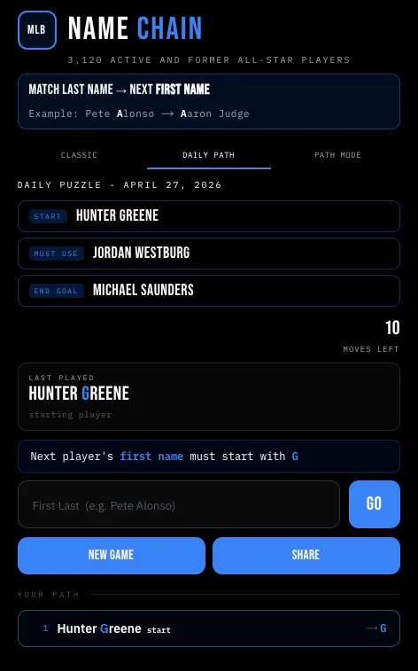 Browser-based daily word puzzle game built on a dataset of 3,120 active and former MLB All-Star players. Players form chains by linking player names where the first letter of each player's last name must match the first letter of the next player's first name (e.g., Pete Alonso → Aaron Judge).