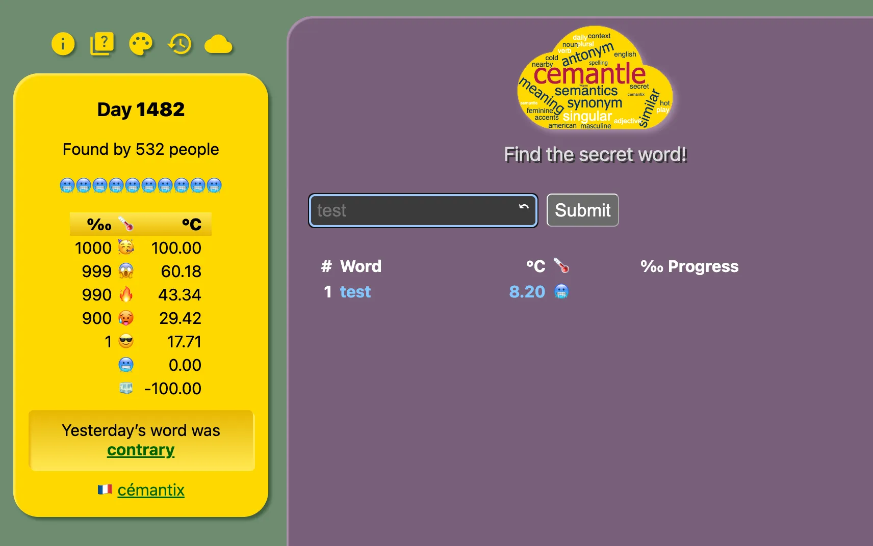 Go to cemantle.certitudes.org and type your first English word into the input box. Today’s secret word is already waiting.