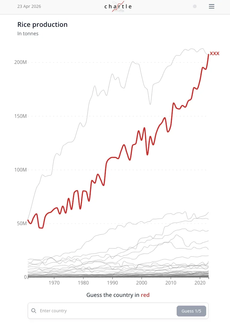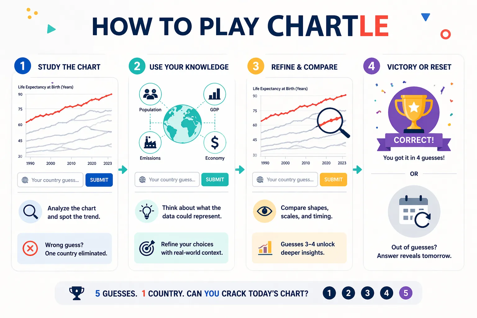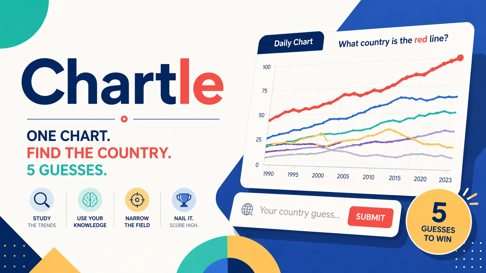 Chartle drops you into a silent battle of data interpretation every single day. A sleek line chart appears with multiple country trends plotted over time—one mysterious red line stands out boldly. Your mission: name the exact country that red line belongs to.
