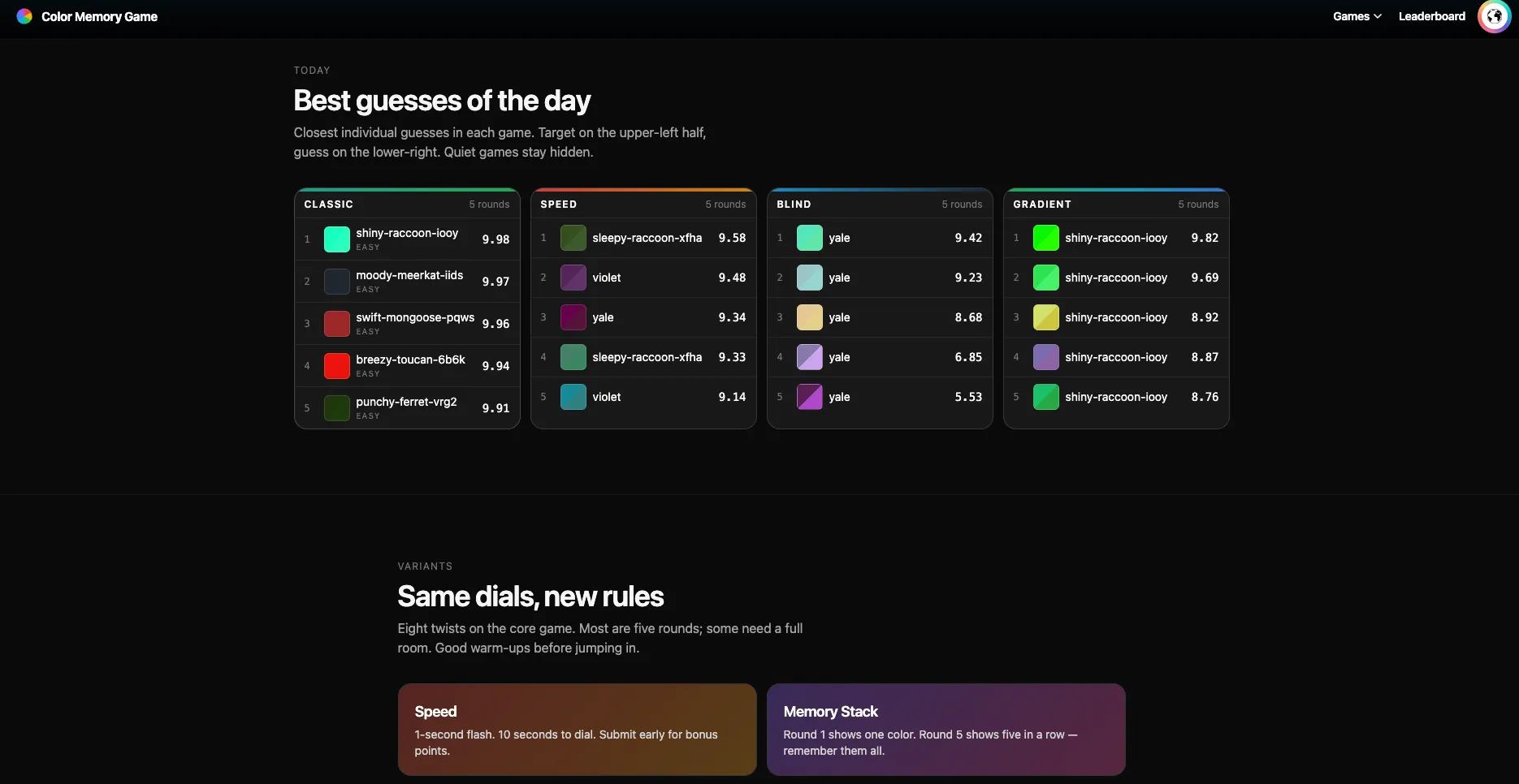 Most people think they’re good with color—until the score hits. Using real perceptual color science (CIELAB + CIEDE2000), the game measures how close your guess really is. It’s simple, addictive, and strangely humbling. Perfect for a quick solo brain workout or chaotic multiplayer rounds with friends.