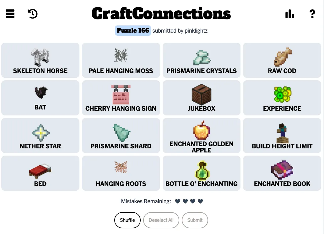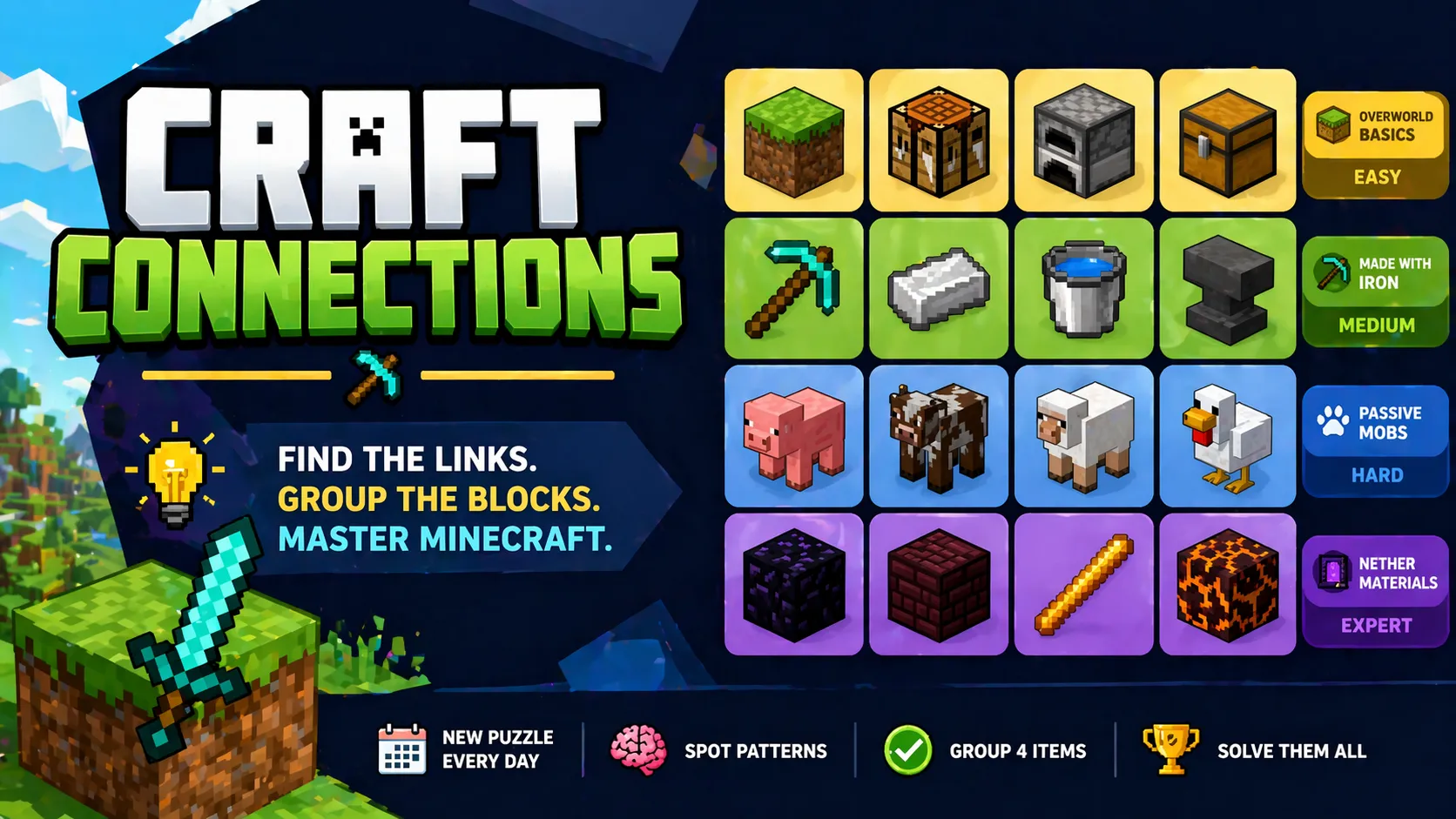Craft Connections turns the beloved NYT Connections formula into a pure Minecraft celebration. You're faced with a 4x4 grid of 16 Minecraft items — blocks, tools, mobs, resources, and more — and must sort them into four groups of four, each united by a sneaky hidden theme. One group might be "all nether-related," another "crafted with iron," while the toughest ones hide clever wordplay or deep game lore.