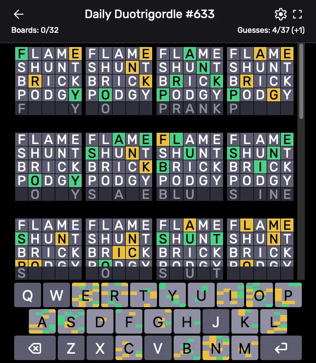 Imagine opening Wordle… and instead of one puzzle, you’re hit with thirty-two. Every guess you type is fired across all boards at once. Letters explode into color everywhere, clues overlap, and your brain scrambles to keep up.
