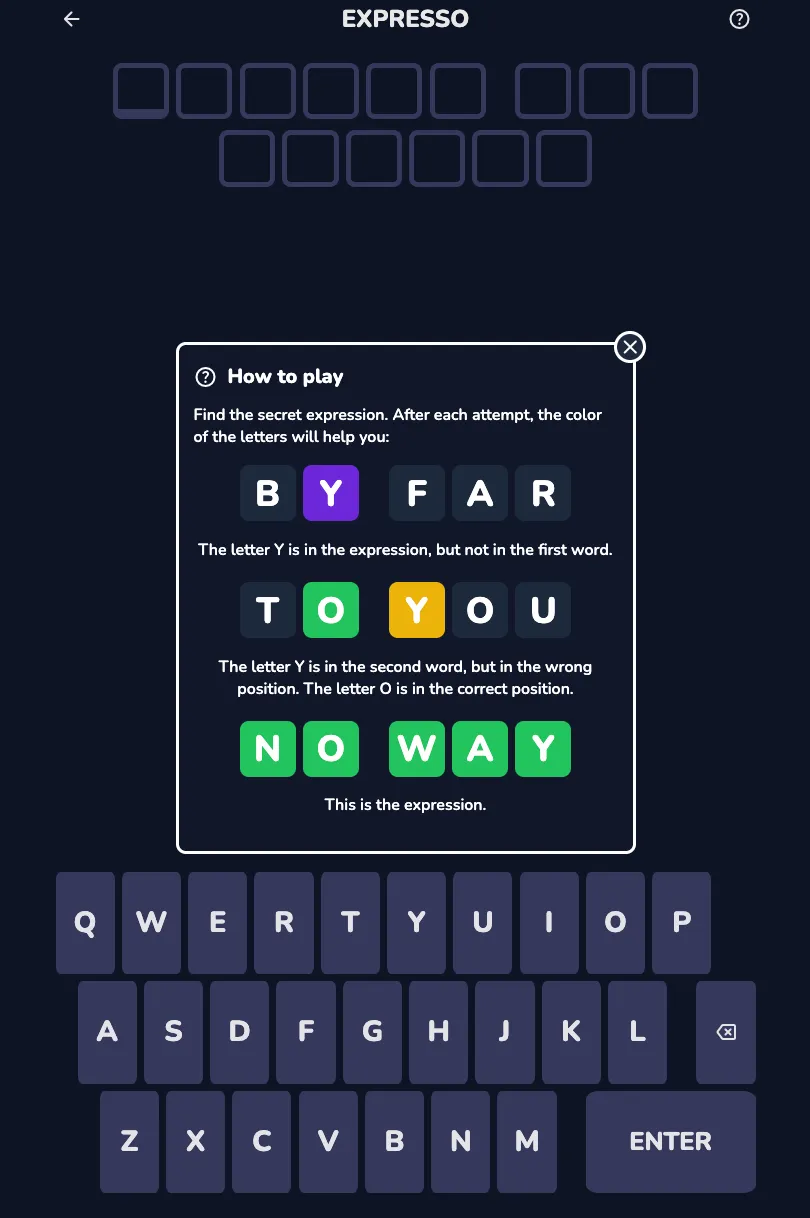 Expresso is a daily word puzzle where you guess a hidden expression or idiom (multiple words) letter by letter. The game reveals the number of words and their lengths upfront, plus color-coded feedback to help you crack the full phrase.