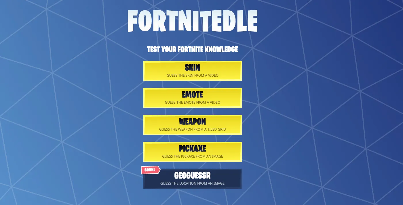 Fortnitedle drops you straight into the Fortnite universe for a daily visual guessing battle. Choose from dedicated modes — Skin, Emote, Weapon, or Pickaxe — and identify the secret item using progressively revealing clues or partial images. One mode might show a cropped video clip of an emote dance, another a tiled grid of a weapon model, turning every session into a high-stakes test of your Battle Royale memory.