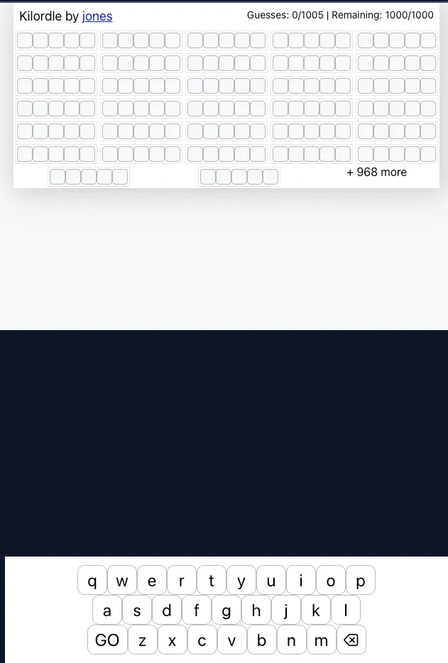Kilordle is the ultimate extreme Wordle variant where players must guess 1000 five-letter words simultaneously! Yes, you read that right - one thousand words at once. Each guess applies to all 1000 words, creating the most ambitious word puzzle challenge ever created.