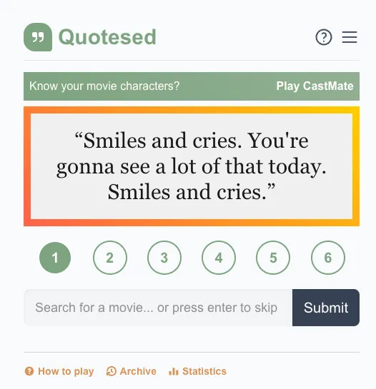 It starts with one short line — familiar yet not quite enough. Then another. And another. Quotesed is the daily movie quote challenge that hands you up to 6 iconic lines from a single film and dares you to name the movie as early as possible.