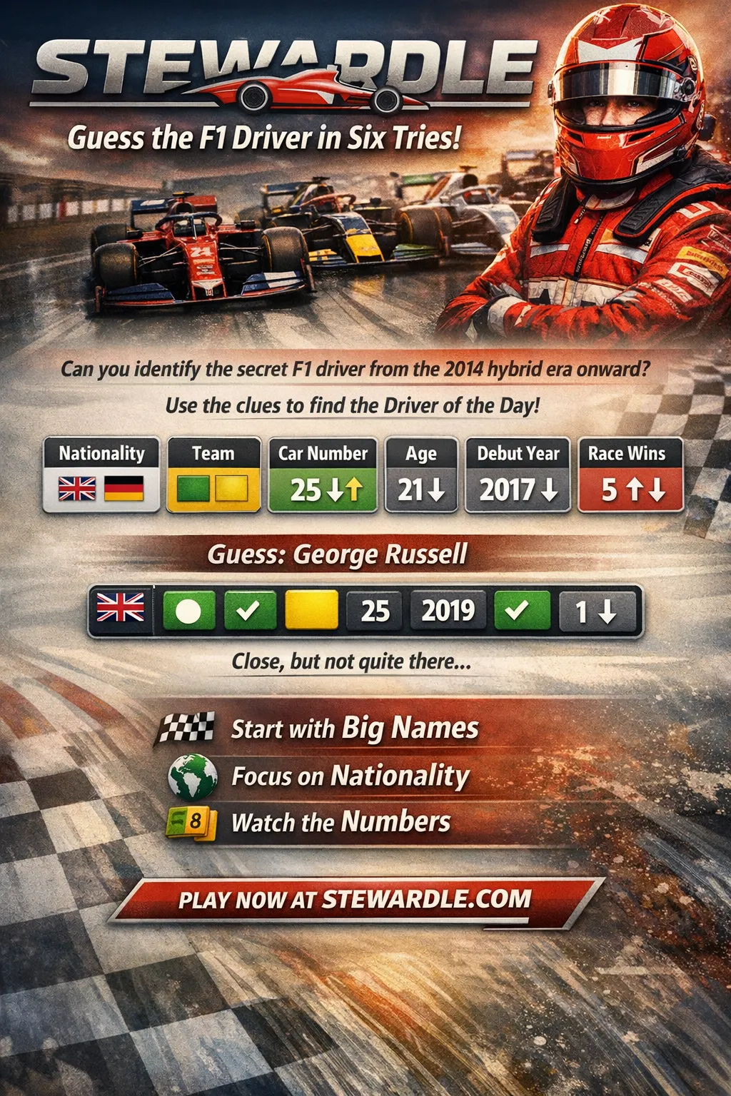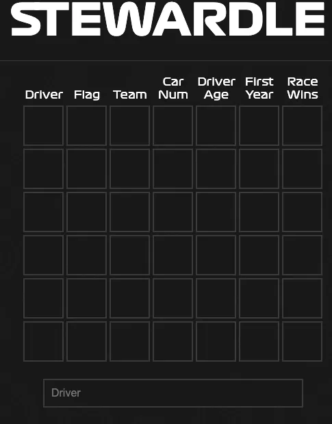 You don’t get a grid of letters. You get a mystery F1 driver from the 2014 season onward — and only six chances to name them. Every guess feeds back colored tiles across six key stats: nationality, current/former team, car number, age, debut year, and race wins.