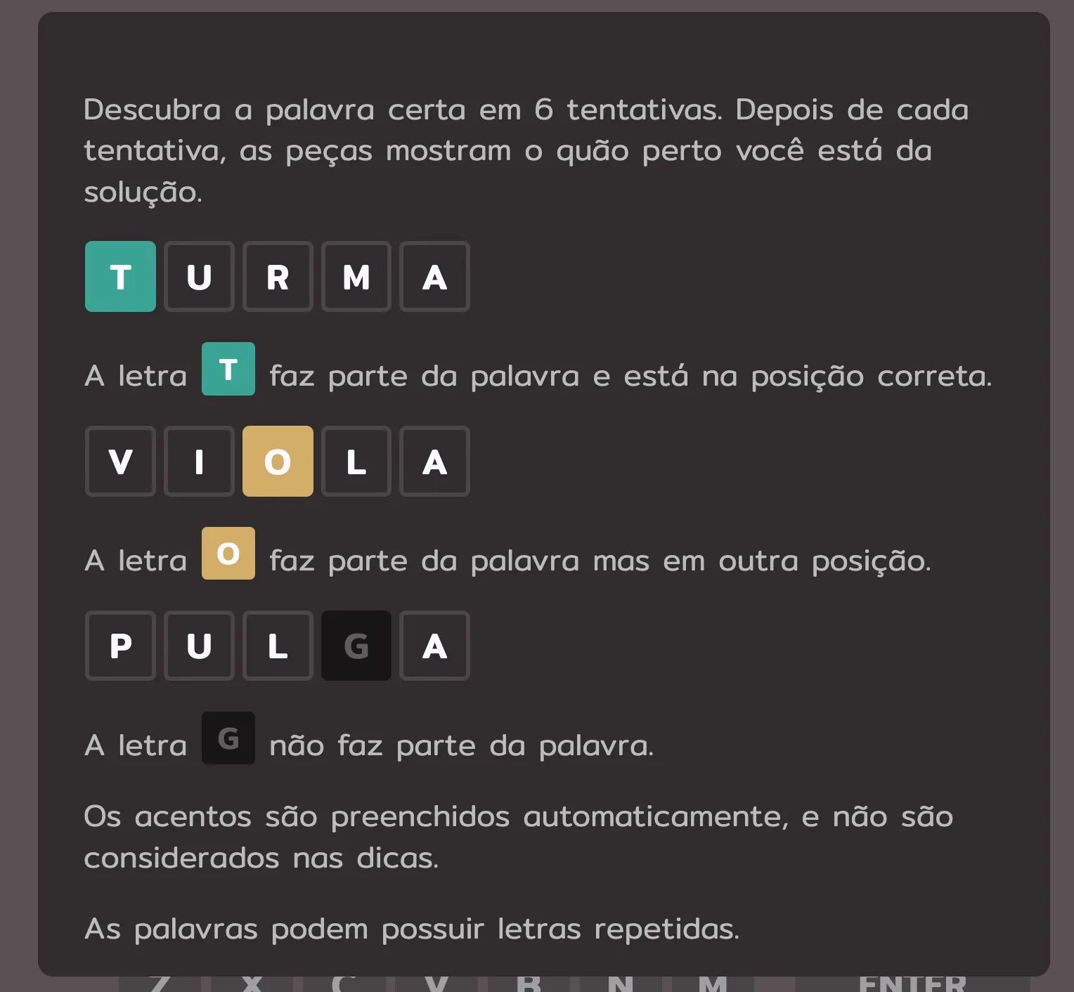 - You MUST guess real 5-letter Portuguese words only (no made-up guesses allowed).