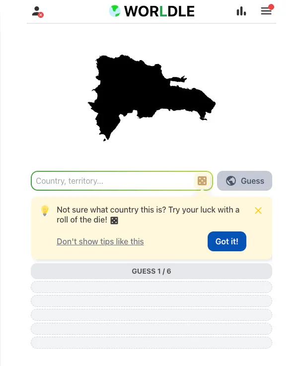 - You have 6 attempts to find the correct country.